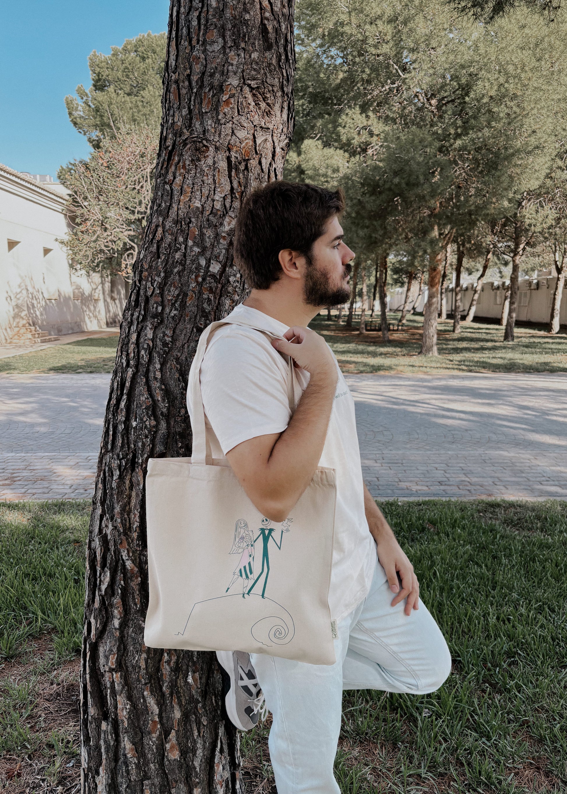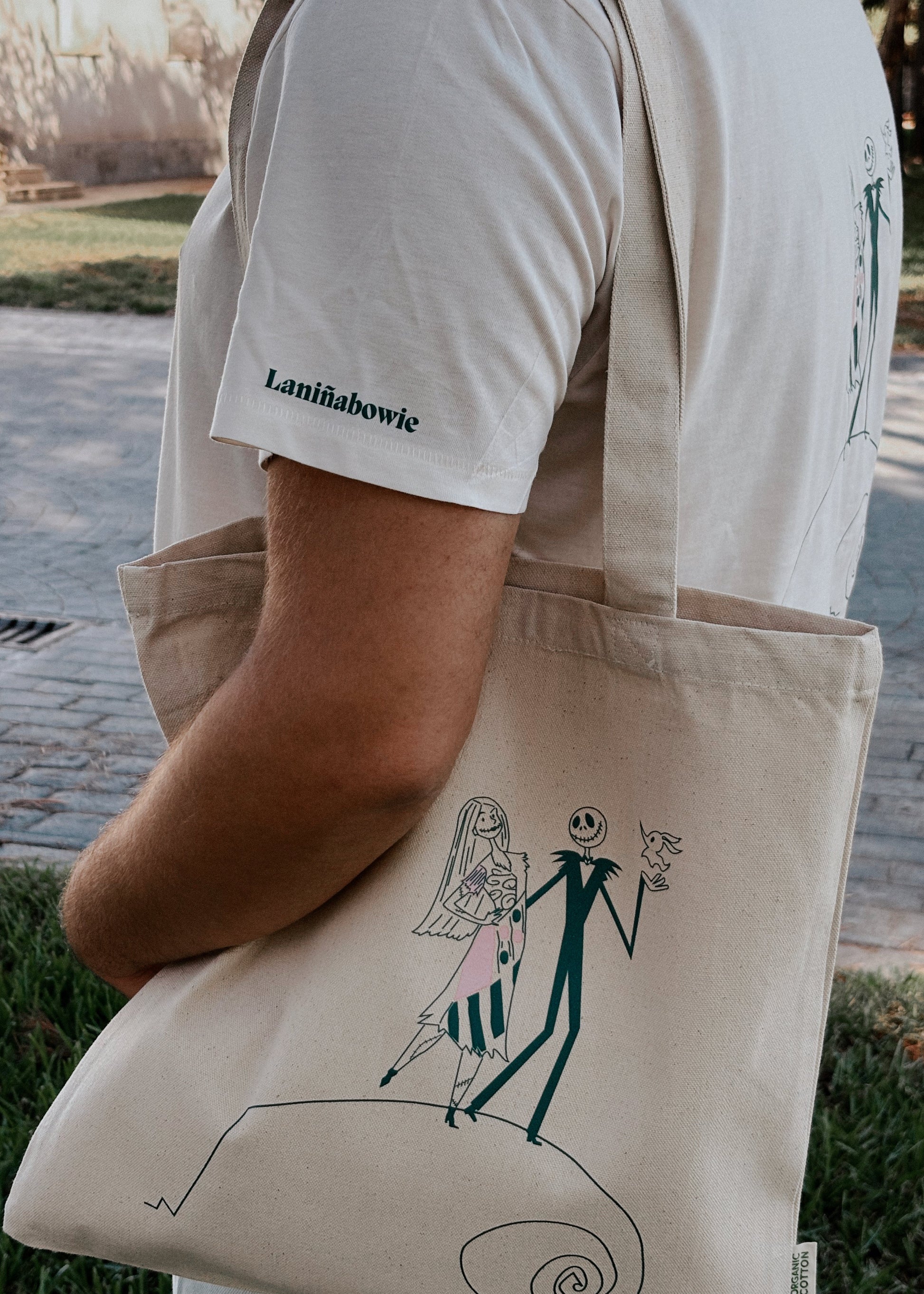 Mágica y práctica . Nuestra tote bag de algodón orgánico en color natural lleva un diseño exclusivo en verde bosque, ilustrado en nuestro taller, con Jack y Sally sobre la montaña de Halloween Town en la parte trasera, capturando toda la esencia romántica y nostálgica de la película.